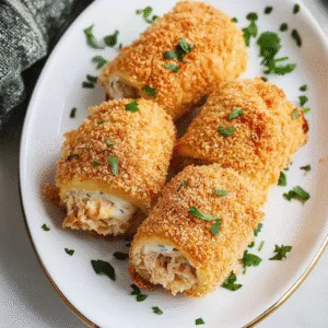 Fold the corners in, roll them up tightly, then dip each in melted butter followed by Italian breadcrumbs. Arrange them on a baking sheet and bake until golden brown and bubbling inside.