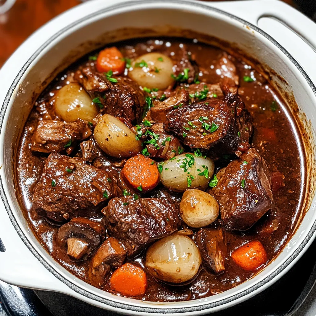 Beef Bourguignon is a soul-warming French classic where tender chunks of beef simmer in a rich red wine gravy with earthy mushrooms, smoky bacon, and fragrant herbs.