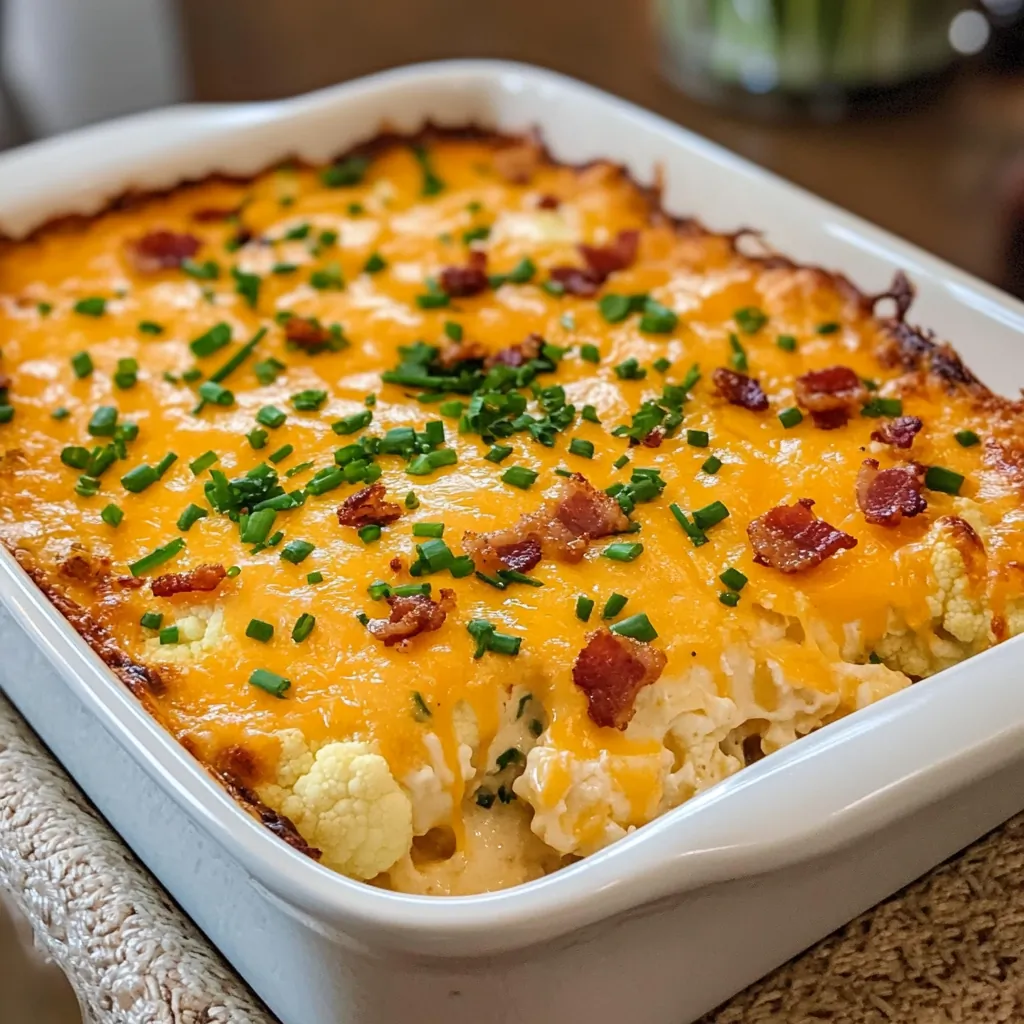 This rich and savory keto-friendly casserole unites fork-tender cauliflower with a luscious blend of cheeses, creamy elements, crispy bacon, and aromatic chives for a truly satisfying vegetable-based entrée or side dish.